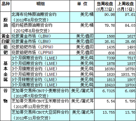 國際大宗商品期貨價格明細表[2012-06-25]