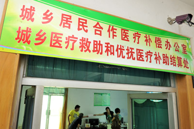 近年來安徽省長豐縣積極探索農(nóng)村醫(yī)療保障制度,實施了按病種付費以及將“農(nóng)民兩險”合并為城鄉(xiāng)居民合作醫(yī)療保險一項的雙舉措,既節(jié)約了醫(yī)藥以及行政成本也降低了農(nóng)民負(fù)擔(dān),受到了農(nóng)民歡迎。這是安徽省長豐縣第一人民醫(yī)院城鄉(xiāng)居民合作醫(yī)療補償辦公室。參加該縣城鄉(xiāng)居民合作醫(yī)療的農(nóng)民在看病后即可就地報銷。