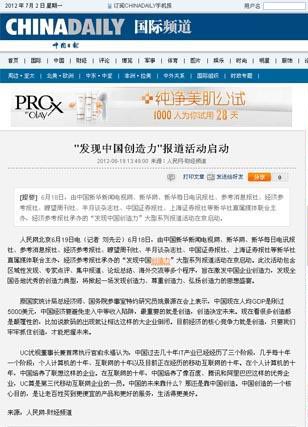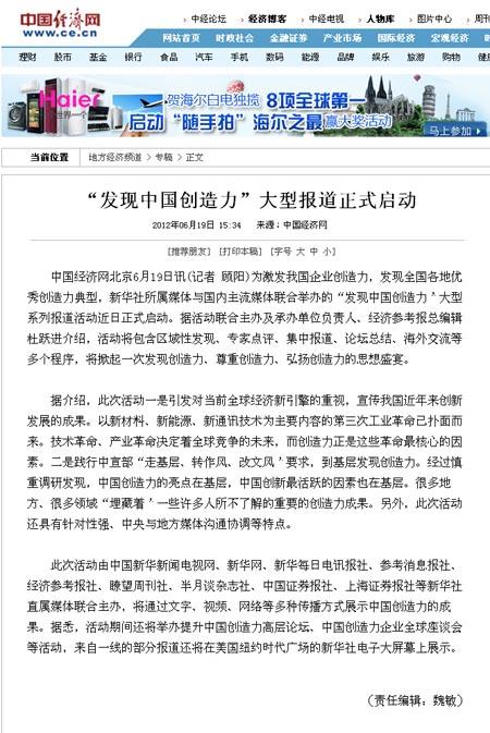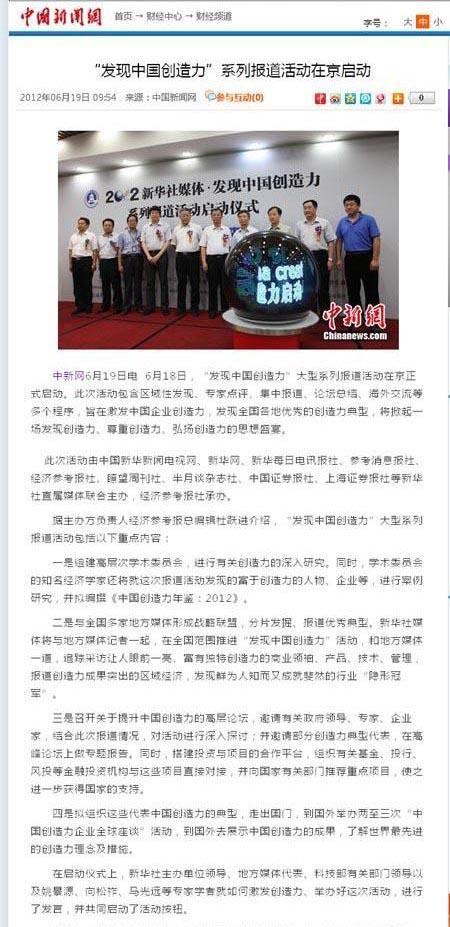 “發(fā)現(xiàn)中國(guó)創(chuàng)造力”系列報(bào)道活動(dòng)已于6月18日正式啟動(dòng),各大網(wǎng)站對(duì)活動(dòng)啟動(dòng)儀式紛紛進(jìn)行報(bào)道。