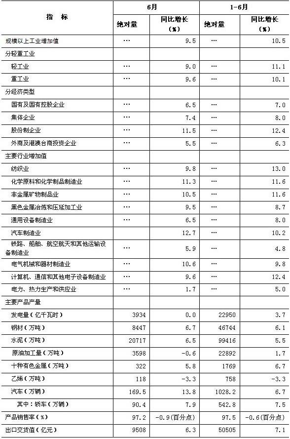 2012年6月份規(guī)模以上工業(yè)生產(chǎn)主要數(shù)據(jù)