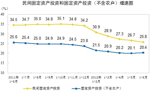 2012年1-6月份,全國民間固定資產(chǎn)投資93657億元,同比名義增長25.8%(扣除價格因素實際增長23.3%),增速比1-5月份回落0.9個百分點。民間固定資產(chǎn)投資占固定資產(chǎn)投資的比重為62.1%,比1-5月份回落0.1個百分點。