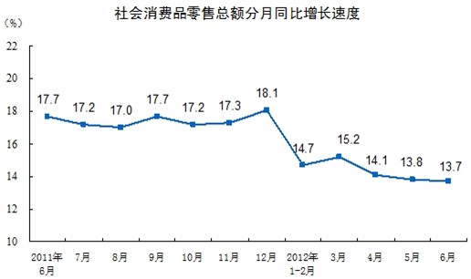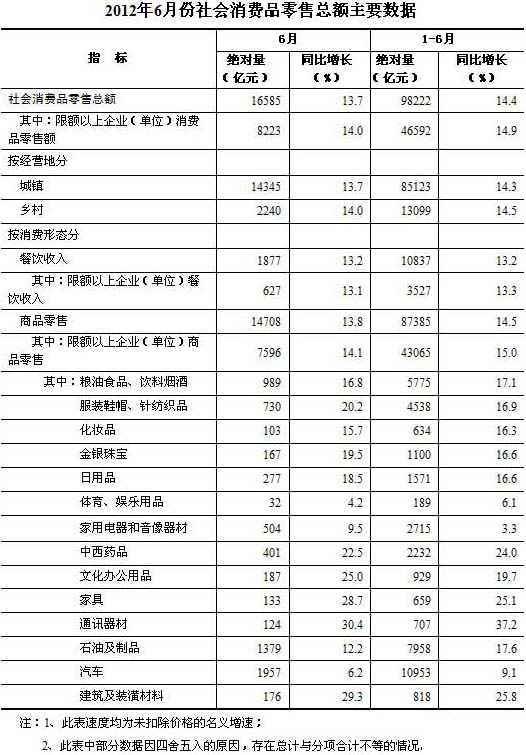 2012年6月份,全國社會消費(fèi)品零售總額16585億元,同比名義增長13.7%(扣除價(jià)格因素實(shí)際增長12.1%,以下除特殊說明外均為名義增長)。其中,限額以上企業(yè)(單位)消費(fèi)品零售額8223億元,增長14%。1-6月份,社會消費(fèi)品零售總額98222億元,同比名義增長14.4%(扣除價(jià)格因素實(shí)際增長11.2%)。從環(huán)比看,6月份社會消費(fèi)品零售總額增長1.08%。