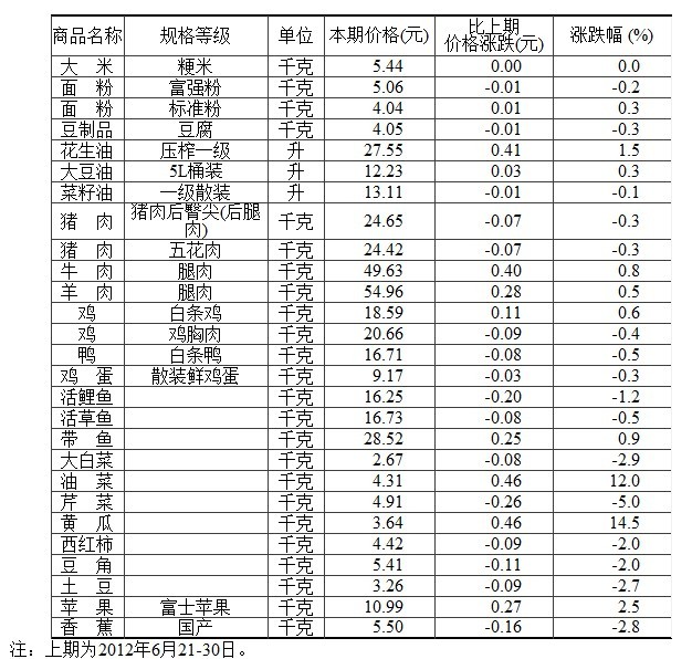 50個(gè)城市主要食品平均價(jià)格變動(dòng)情況(2012年7月1-10日)
