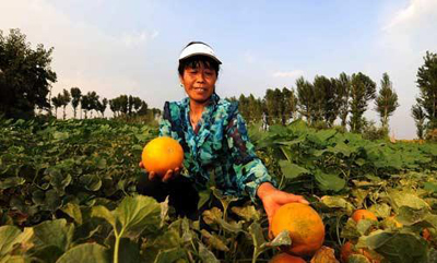 當(dāng)?shù)剞r(nóng)民展示河套蜜瓜。