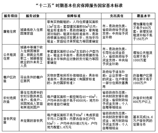 加快建立健全基本住房保障服務(wù)國(guó)家標(biāo)準(zhǔn)體系。依據(jù)基本住房保障有關(guān)政策規(guī)定,為保證保障性住房的供給規(guī)模和質(zhì)量,明確工作任務(wù)的事權(quán)與支出責(zé)任,制定“十二五”時(shí)期基本住房保障服務(wù)國(guó)家基本標(biāo)準(zhǔn)。