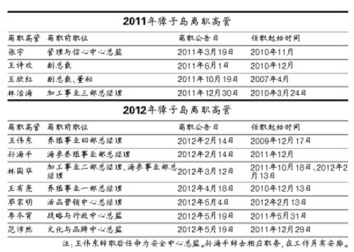 從2010年1月5日,獐子島人力資源中心總監(jiān)白長青、采購中心總監(jiān)趙韶翊離職開始,至2012年5月19日,戰(zhàn)略與行政中心總監(jiān)李冬霄、文化與品牌中心總監(jiān)范沛然離職,以及另有工作安排的孫海平,兩年多時間內(nèi)獐子島辭職的高管已經(jīng)達到14人。