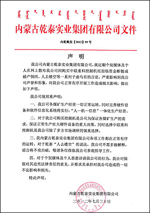 聲明同時(shí)表示,“乾泰公司各煤礦生產(chǎn)經(jīng)營一切正常運(yùn)轉(zhuǎn)。同時(shí)完善硬件設(shè)備和軟件信息化系統(tǒng)將實(shí)現(xiàn):‘人——機(jī)——信息’一體化生產(chǎn)經(jīng)營;對(duì)于我公司購買挖掘機(jī)是保證各煤礦生產(chǎn)的需求,保證正常生產(chǎn)壯大硬件設(shè)備的重大決策,同時(shí)選擇在中聯(lián)重科挖掘機(jī)是我公司做了多方市場(chǎng)調(diào)研的慎重選擇。我內(nèi)蒙古乾泰實(shí)業(yè)集團(tuán)有限公司各項(xiàng)工作都在正常有序的運(yùn)轉(zhuǎn),對(duì)于乾泰‘人去樓空’的說法,我公司不需多做解釋,謠言將不攻自破,敬請(qǐng)各位蒞臨我公司參觀指導(dǎo)工作。”