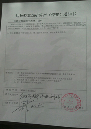 另一份則為內(nèi)蒙古達(dá)拉特旗煤炭局針對(duì)達(dá)拉特旗納林豐勝奎煤礦的停產(chǎn)通知書,通知書指出,“豐勝奎煤礦采區(qū)位于河道行洪區(qū)域,現(xiàn)正值防汛主汛期,存在重大安全隱患,責(zé)令你礦立即將采場(chǎng)工作人員和機(jī)械撤離至安全區(qū)域,全面停止采場(chǎng)一切采剝作業(yè);立即拆除河道內(nèi)煤礦工人生活區(qū)臨時(shí)建筑,將人員安置到安全地帶;待主汛期(6月15日—9月15日)之后方可復(fù)工生產(chǎn);進(jìn)一步完善雨季三防工作方案。