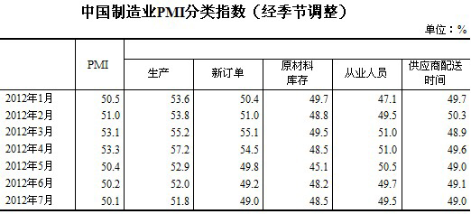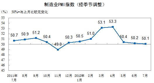 2012年7月,中國制造業(yè)采購經(jīng)理指數(shù)(PMI)為50.1%,比上月微落0.1個(gè)百分點(diǎn),略高于臨界點(diǎn)。
