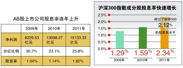 權威統(tǒng)計數(shù)據(jù)顯示,2009至2011年的三年間,AB股上市公司凈利潤分別為8229.53億元、13098.27億元、15133.33億元;AB股公司分紅比例分別為30.7%、23.1%、25.8%;而其股息率則呈現(xiàn)連年上升,分別為1.04%、1.14%、1.82%,這一水平與境外主要成熟市場相比并不低。