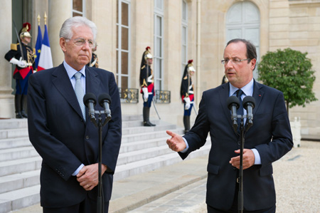 法國總統(tǒng)弗朗索瓦·奧朗德與意大利總理馬里奧·蒙蒂7月31日在巴黎會晤后發(fā)表聯(lián)合聲明說,法意兩國在根本上與歐元區(qū)完整性緊密相連,決心采取一切措施捍衛(wèi)歐元區(qū)。