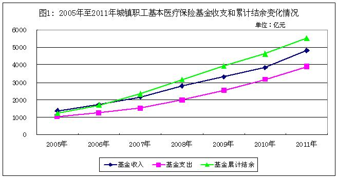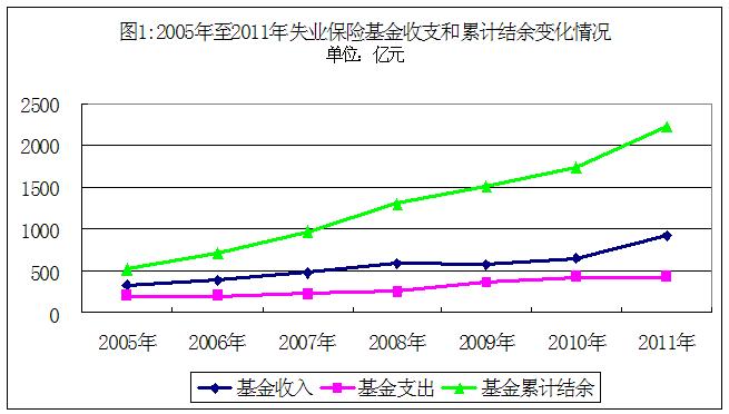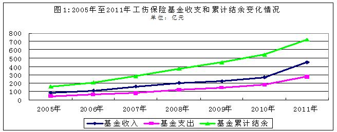 2011年,全國生育保險(xiǎn)基金收入合計(jì)214.85億元,比2005年增長4.14倍;基金支出合計(jì)136.22億元,比2005年增長4.16倍;截至2011年底,基金累計(jì)結(jié)余330.93億元,比2005年底增長3.74倍(2005年至2011年生育保險(xiǎn)基金收支和累計(jì)結(jié)余變化情況見圖1)。