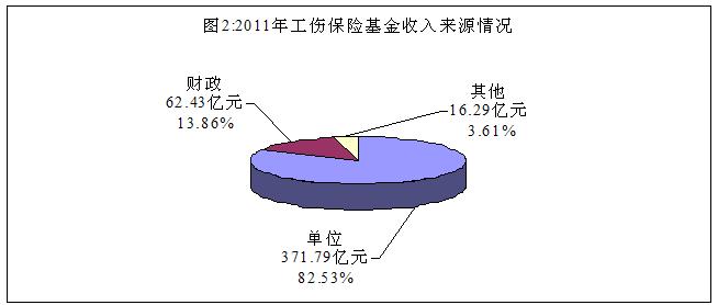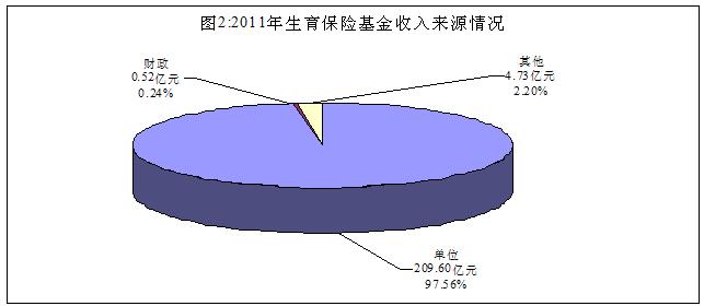 2011年基金收入中,來源于單位、財(cái)政和其他的收入分別為209.60億元、0.52億元和4.73億元,分別占97.56%、0.24%和2.20%(見圖2)。