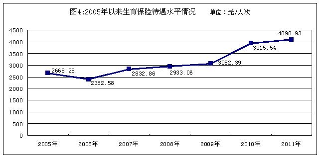 近年來,生育保險(xiǎn)待遇水平穩(wěn)步提高。2011年,生育保險(xiǎn)平均待遇每人次4098.93元,比2005年增加1430.65元,增長53.62%,年均增長7.42%,婦女生育保障水平穩(wěn)步提高(見圖4)。