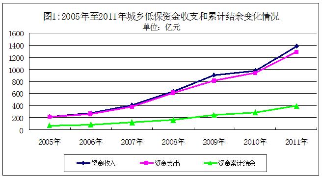 2011年,全國城鄉(xiāng)低保資金收入合計(jì)1384.95億元,比2005年增長5.36倍;支出合計(jì)1284.14億元,比2005年增長5.22倍;截至2011年底,資金累計(jì)結(jié)余393.71億元,比2005年底增長4.87倍(2005年至2011年城鄉(xiāng)低保資金收支和累計(jì)結(jié)余變化情況見圖1)。