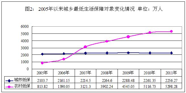 2007年,農(nóng)村低保制度在全國范圍內(nèi)開展,加之各地不斷提高城鄉(xiāng)低保保障標(biāo)準(zhǔn),越來越多的人被納入了低保范圍。截至2011年底,全國城市和農(nóng)村低保對(duì)象分別有2256.27萬人和5298.28萬人,分別比2005年底增長7.25%和551.04%(2005年以來城鄉(xiāng)最低生活保障對(duì)象變化情況見圖2)。低收入群體的基本生活得到保障,維護(hù)了社會(huì)和諧穩(wěn)定。