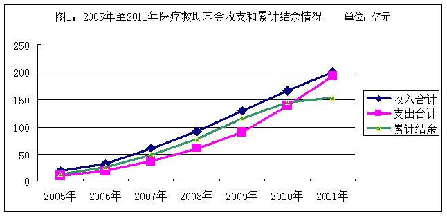 2011年,全國醫(yī)療救助基金收入合計(jì)200.94億元,比2005年增長10倍;支出合計(jì)192.89億元,比2005年增長18.95倍;截至2011年底,基金累計(jì)結(jié)余154.06億元,比2005年底增長10.6倍(2005年至2011年醫(yī)療救助基金收支和累計(jì)結(jié)余情況見圖1)。