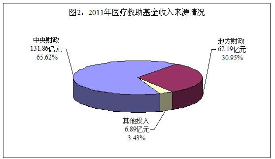 2011年醫(yī)療救助基金收入中,來源于中央財(cái)政、地方財(cái)政和其他渠道的分別為131.86億元、62.19億元和6.89億元,分別占65.62%、30.95%和3.43%(見圖2)。
