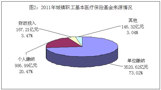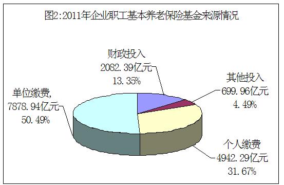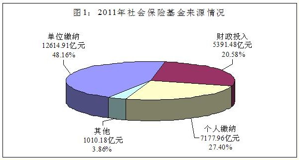 2011年,社會(huì)保險(xiǎn)基金收入26 194.53億元中,單位繳費(fèi)、個(gè)人繳費(fèi)、財(cái)政投入和其他投入分別為12
