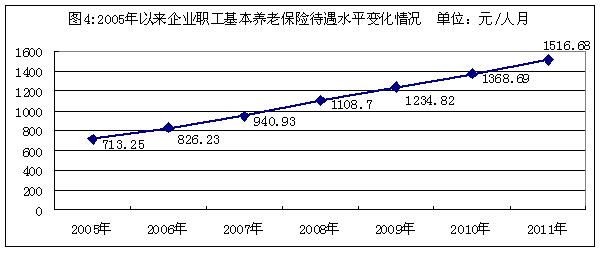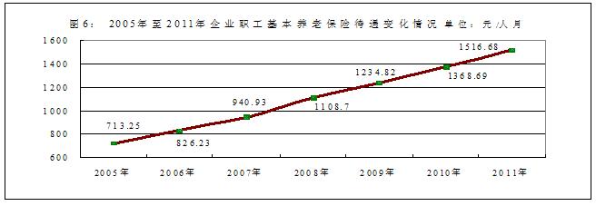 近年來,國家穩(wěn)步提高了養(yǎng)老、醫(yī)療、低保等社會(huì)保障水平,在實(shí)現(xiàn)老有所養(yǎng)、病有所醫(yī)、困有所扶,共享發(fā)展成果方面取得明顯成效。從基本養(yǎng)老保險(xiǎn)看,2005年至2011年,國家連續(xù)7次調(diào)增企業(yè)職工基本養(yǎng)老保險(xiǎn)待遇水平,年均增長13.40%,由2005年的每人每月713.25元提高到2011年的每人每月1516.68元(2005年至2011年企業(yè)職工基本養(yǎng)老保險(xiǎn)待遇變化情況見圖6),比同期居民消費(fèi)價(jià)格指數(shù)(CPI)平均上漲幅度高出10.03個(gè)百分點(diǎn)。