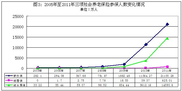 2005年以來,我國先后出臺(tái)了20多項(xiàng)社會(huì)保障政策規(guī)定,建立了農(nóng)村最低生活保障制度,開展了城鎮(zhèn)居民基本醫(yī)療保險(xiǎn)試點(diǎn)、新農(nóng)保試點(diǎn)和城居保試點(diǎn),歷史上首次為農(nóng)村居民、城鎮(zhèn)居民建立了較完備的社會(huì)保障制度,社會(huì)保障向人人享有基本生活保障的目標(biāo)不斷推進(jìn)。新農(nóng)保和城鄉(xiāng)居民養(yǎng)老保險(xiǎn)參保人數(shù)由2009年制度建立當(dāng)年的0.27億人,增加到2011年的3.55億人,增長12.15倍;新農(nóng)合、城鎮(zhèn)居民醫(yī)療保險(xiǎn)和城鄉(xiāng)居民醫(yī)療保險(xiǎn)2005年的參保人數(shù)為2.16億人,到2011年超過10億人,增長3.89倍,社會(huì)保險(xiǎn)在農(nóng)村覆蓋面快速擴(kuò)大。基本養(yǎng)老和基本醫(yī)療保險(xiǎn)2005年覆蓋人群分別為1.61億人和3.45億人,到2011年底分別超過6億人和13億人,分別增長2.86倍和2.77倍(2005年至2011年社會(huì)保險(xiǎn)參保人數(shù)變化情況見圖2)。