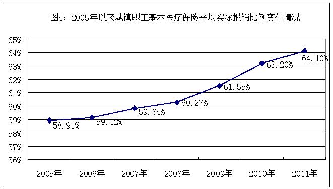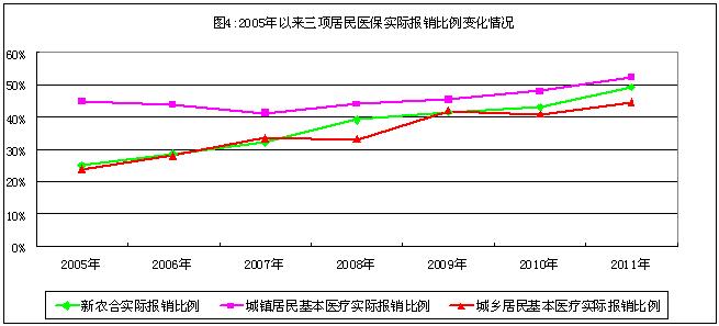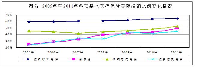 從基本醫(yī)療保險(xiǎn)看,城鎮(zhèn)職工基本醫(yī)療保險(xiǎn)、城鎮(zhèn)居民基本醫(yī)療保險(xiǎn)和新農(nóng)合在國家基本醫(yī)療保險(xiǎn)“三個(gè)目錄”政策范圍內(nèi)的報(bào)銷比例②逐年提高,到2011年分別達(dá)到了77%、62%和70%;踞t(yī)療保險(xiǎn)的實(shí)際報(bào)銷比例③近年來也穩(wěn)步上升,農(nóng)村尤為顯著。城鎮(zhèn)職工基本醫(yī)療保險(xiǎn)、城鎮(zhèn)居民基本醫(yī)療保險(xiǎn)實(shí)際報(bào)銷比例分別由2005年的58.91%和45.00%,提高到2011年的64.10%和52.28%,分別增長8.81%和16.18%;新農(nóng)合和城鄉(xiāng)居民醫(yī)療保險(xiǎn)實(shí)際報(bào)銷比例分別由2005年的24.80%和23.78%,提高到2011年的49.20%和44.87%,分別增長98.39%和88.69%(2005年至2011年各項(xiàng)基本醫(yī)療保險(xiǎn)實(shí)際報(bào)銷比例變化情況見圖7)。