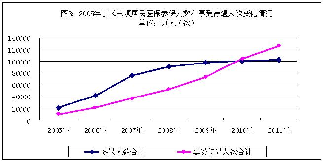 1.社會(huì)保險(xiǎn)制度體系情況。至2011年底,基本醫(yī)療保險(xiǎn)實(shí)現(xiàn)全覆蓋,城鎮(zhèn)職工基本醫(yī)療保險(xiǎn)、城鎮(zhèn)居民基本醫(yī)療保險(xiǎn)和新型農(nóng)村合作醫(yī)療(以下簡稱新農(nóng)合)制度體系覆蓋全國所有縣,參保人數(shù)合計(jì)超過13億人,比2005年增長2.77倍,其中189個(gè)縣合并實(shí)施了城鄉(xiāng)居民醫(yī)療保險(xiǎn);基本養(yǎng)老保險(xiǎn)覆蓋面迅速擴(kuò)大,企業(yè)職工基本養(yǎng)老保險(xiǎn)已覆蓋全國所有縣,新型農(nóng)村社會(huì)養(yǎng)老保險(xiǎn)(以下簡稱新農(nóng)保)已覆蓋81.50%的縣,城鎮(zhèn)居民社會(huì)養(yǎng)老保險(xiǎn)(以下簡稱城居保)已覆蓋75.30%的縣,參保人數(shù)合計(jì)6.22億人,比2005年增長2.86倍,其中683個(gè)縣合并實(shí)施了城鄉(xiāng)居民養(yǎng)老保險(xiǎn);失業(yè)、工傷和生育保險(xiǎn)與企業(yè)職工基本養(yǎng)老、城鎮(zhèn)職工基本醫(yī)療保險(xiǎn)同步開展,參保人數(shù)分別達(dá)到了1.42億人、1.70億人和1.22億人。