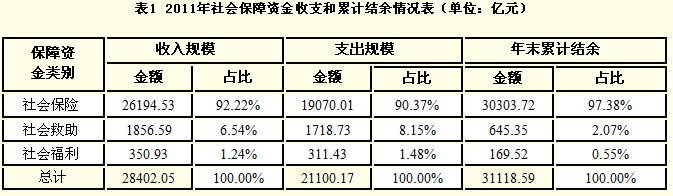 “十一五”以來,社會(huì)保障資金規(guī)模迅速擴(kuò)大,為社會(huì)保障制度可持續(xù)發(fā)展奠定了較為堅(jiān)實(shí)的物質(zhì)基礎(chǔ)。截至2011年底,社會(huì)保險(xiǎn)基金累計(jì)結(jié)余30