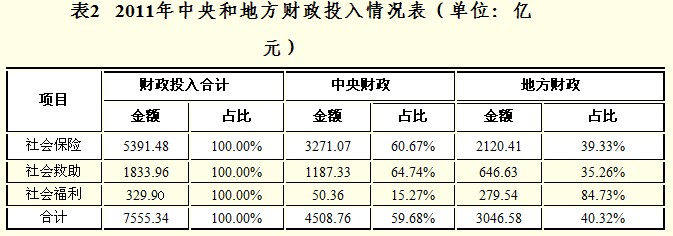 在2011年的18項(xiàng)社會(huì)保障資金財(cái)政投入中,中央和地方財(cái)政分別投入4508.76億元、3046.58億元,分別比2005年增長534.15%和632.01%,中央財(cái)政對(duì)社會(huì)保險(xiǎn)、社會(huì)救助和社會(huì)福利的投入分別占60.67%、64.74%和15.27%(詳見表2)。
