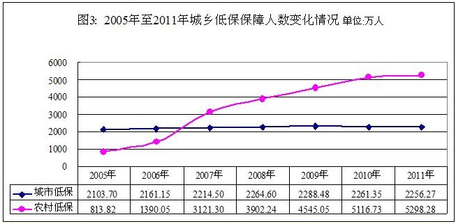 隨著社會(huì)救助工作力度的加大和救助標(biāo)準(zhǔn)的不斷提高,社會(huì)救助覆蓋范圍不斷擴(kuò)大。2011年底納入最低生活保障的人數(shù)達(dá)到7554.55萬人,比2005年的2917.52萬人增長1.59倍(2005年至2011年城鄉(xiāng)低保保障人數(shù)變化情況見圖3)。