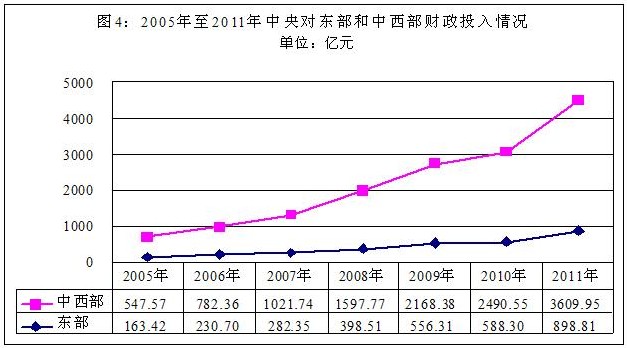 從社會(huì)保障投入看,重點(diǎn)向欠發(fā)達(dá)地區(qū)傾斜、向農(nóng)村傾斜,著力縮小區(qū)域間的社會(huì)保障差距。2005年以來,中央財(cái)政對(duì)全國社會(huì)保障的投入中,中西部所占比重保持在80%左右,對(duì)中西部的投入由2005年的547.57億元增加到2011年的3609.95億元,增長5.59倍(2005年至2011年中央對(duì)東部和中西部財(cái)政投入情況見圖4)。