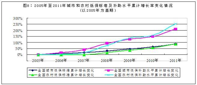 從最低生活保障看,城市居民和農(nóng)村最低生活保障平均保障標(biāo)準(zhǔn)分別由2005年的月人均154.30元和74.83元,提高到2011年的月人均288.04元和140.29元,分別增長86.68%和87.48%;月人均補(bǔ)助水平分別由2005年的73.34元和28.37元,提高到2011年的227.92元和100.07元,分別增長210.77%和252.73%(2005年至2011年城市和農(nóng)村低保標(biāo)準(zhǔn)及補(bǔ)助水平累計(jì)增長率變化情況見圖8)。