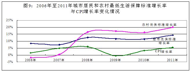 2006年至2011年,城市居民和農(nóng)村最低生活保障標(biāo)準(zhǔn)平均增長率為10.99%和11.40%,比同期CPI平均上漲幅度分別高出7.62和8.03個(gè)百分點(diǎn)。特別是2007年在全國普遍實(shí)施農(nóng)村最低生活保障制度以來,保障標(biāo)準(zhǔn)平均增長率比同期CPI平均上漲幅度高出14.02個(gè)百分點(diǎn)(2006年至2011年城市居民和農(nóng)村最低生活保障標(biāo)準(zhǔn)增長率與CPI增長率變化情況見圖9)。