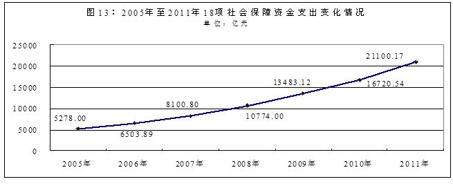18項(xiàng)社會(huì)保障資金支出由2005年的5278億元增至2011年的21100.17億元,增長299.78%(2005年至2011年18項(xiàng)社會(huì)保障資金支出變化情況見圖13)。