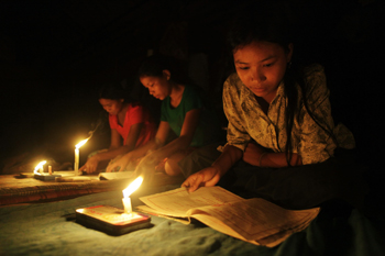 8月1日,在印度高哈蒂市郊區(qū),因大面積停電,幾名女孩在燭光下看書。新華社/美聯(lián) |