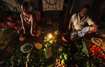 7月31日,在印度加爾各答,因為大面積停電,兩名商販點著燭光等候顧客選購蔬菜。新華社/路透 |