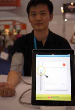 日前,蘋果產(chǎn)業(yè)鏈大會——Macworld | iWorld 2012數(shù)字亞洲博覽會在京舉行。記者發(fā)現(xiàn),與會中國企業(yè)大多處于利潤空間較小的產(chǎn)業(yè)鏈下游。而業(yè)界人士指出,中國企業(yè)有望借助移動互聯(lián)網(wǎng)的飛速發(fā)展,在蘋果產(chǎn)業(yè)鏈中獲得更高利潤,甚至顛覆整個產(chǎn)業(yè)鏈。圖為工作人員展示九安醫(yī)療電子股份有限公司開發(fā)的“移動互聯(lián)血壓計”。