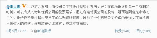 除此之外,李大霄還指出,此時優(yōu)質(zhì)公司推員工計劃是積德,中國有兩個好老板值得表揚,一個是馬明哲,第二個是任正非,要將股份分給忠心耿耿的高管及員工。支持這一觀點的網(wǎng)友“計驊”認為,上市公司確實可以利用估值較低的機會加大員工持股及期權(quán)計劃的實施力度。但多數(shù)網(wǎng)友表達了不同意見,網(wǎng)友“成熟的投資人”表示,粗看了一下員工持股管理辦法,總體感覺不會有什么實際效果。怎能要求員工如實向公司說明其家庭金融資產(chǎn)情況?!退一萬步,在現(xiàn)有規(guī)則下即使要持股也可以自行買。要求上市公司在破凈等情況下須回購股票更具意義!也有網(wǎng)友表示,還是股權(quán)激勵會更有效些。