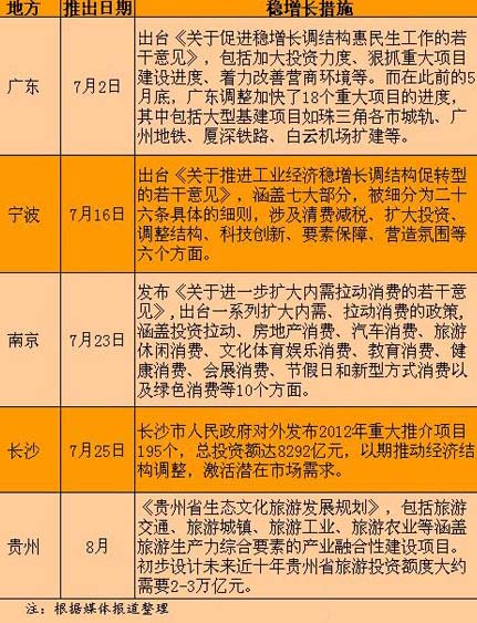 除了中央投資力度不斷增長(zhǎng)外,各地也陸續(xù)出臺(tái)各種政策,增加投資規(guī)模。中新網(wǎng)財(cái)經(jīng)頻道統(tǒng)計(jì)發(fā)現(xiàn),7月以來(lái),廣東、寧波、南京、長(zhǎng)沙、貴州等多個(gè)省市出臺(tái)穩(wěn)增長(zhǎng)若干措施,拉開地方穩(wěn)增長(zhǎng)大幕。
