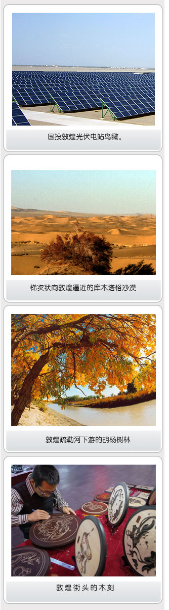 | 浩如煙海的古籍,氣象萬千的古跡,將敦煌變成了歷史文化名城;借助豐富的光熱資源,當?shù)卣謱⑵浯蛟斐闪恕按竽怆姵恰。給敦煌帶來無盡能源的,仍然是獵獵朔風、炎炎烈日。風吹日曬,曾經如浮云般的景象,如今成為敦煌的新寵兒。[詳細] | |