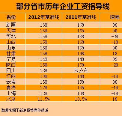 中新網(wǎng)財經(jīng)頻道統(tǒng)計發(fā)現(xiàn),截至8月7日,北京、天津、上海、河北、山西、山東、寧夏、陜西、四川、新疆、青海、江西、云南、甘肅這14個省(自治區(qū)、直轄市)已經(jīng)先后發(fā)布了2012年度企業(yè)工資指導(dǎo)線。