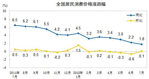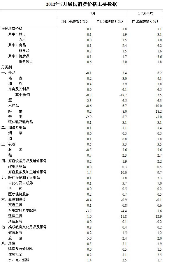 2012年7月份,全國居民消費(fèi)價(jià)格總水平同比上漲1.8%。其中,城市上漲1.9%,農(nóng)村上漲1.5%;食品價(jià)格上漲2.4%,非食品價(jià)格上漲1.5%;消費(fèi)品價(jià)格上漲1.7%,服務(wù)項(xiàng)目價(jià)格上漲2.0%。1-7月平均,全國居民消費(fèi)價(jià)格總水平比去年同期上漲3.1%。