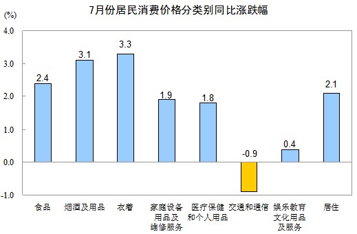 7月份,非食品價(jià)格環(huán)比上漲0.2%。其中,娛樂教育文化用品及服務(wù)、居住、家庭設(shè)備用品及維修服務(wù)、煙酒及用品、醫(yī)療保健和個(gè)人用品價(jià)格分別上漲0.8%、0.5%、0.2%、0.1%和0.1%,衣著、交通和通信價(jià)格分別下降0.5%和0.4%。娛樂教育文化用品及服務(wù)中,旅游價(jià)格上漲5.0%。居住中,水、電、燃料價(jià)格上漲1.4%。