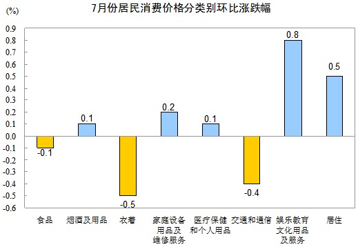 7月份,全國居民消費(fèi)價(jià)格總水平環(huán)比上漲0.1%。其中,城市上漲0.1%,農(nóng)村持平(漲跌幅度為0);食品價(jià)格下降0.1%,非食品價(jià)格上漲0.2%;消費(fèi)品價(jià)格下降0.1%,服務(wù)項(xiàng)目價(jià)格上漲0.6%。