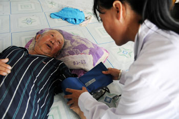黑龍江省鶴崗市蘿北縣2009年被確定為黑龍江省首批基層醫(yī)藥衛(wèi)生體制綜合改革試點縣之一,醫(yī)改三年以來,切實減輕了老百姓的“藥擔(dān)子”,加上鄉(xiāng)鎮(zhèn)鄉(xiāng)村一體化管理,醫(yī)生定期回訪、為村民體檢,暖了鄉(xiāng)鎮(zhèn)老百姓的“心窩子”。 圖為蘿北縣團結(jié)鎮(zhèn)紅衛(wèi)村衛(wèi)生所醫(yī)生李明晶(右)在為一位村民進行血壓測量并詢問近期身體情況。記者