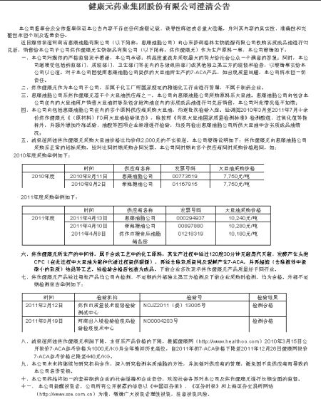一、本公司對(duì)媒體的嚴(yán)格監(jiān)督表示感謝,本公司承諾:將高度重視并采取最大的努力給社會(huì)公眾一個(gè)滿意的答復(fù);同時(shí),本公司愿接受包括藥監(jiān)部門、質(zhì)監(jiān)部門、衛(wèi)生部門等在內(nèi)的各級(jí)政府部門或其他獨(dú)立第三方的監(jiān)督和檢查,以澄清事實(shí)給本公司以公道。對(duì)于本公司因使用惠康油脂公司提供的大豆油所生產(chǎn)的7-ACA產(chǎn)品,如出現(xiàn)質(zhì)量問題,本公司將承擔(dān)一切責(zé)任。