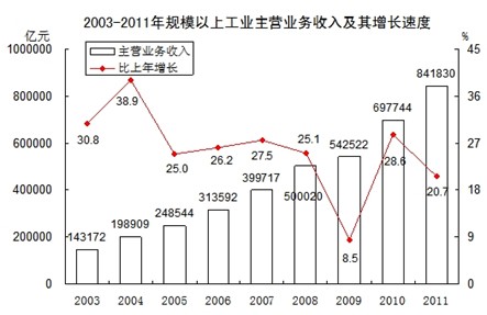 工業(yè)保持較快增長。2003-2011年,我國規(guī)模以上工業(yè)增加值年均增長15.4%,其中2003-2007年年均增長17%。國際金融危機(jī)爆發(fā)之后,我國迅速采取有力措施,積極應(yīng)對(duì)巨大沖擊,很快走出低谷,保持了平穩(wěn)較快發(fā)展的良好態(tài)勢,在遭受危機(jī)沖擊最嚴(yán)重的2009年,規(guī)模以上工業(yè)依然保持了11%的增速,為全球經(jīng)濟(jì)的穩(wěn)定與發(fā)展,作出了巨大的貢獻(xiàn)。2003-2010年,工業(yè)對(duì)國民經(jīng)濟(jì)增長的年均貢獻(xiàn)率超過45%,是拉動(dòng)國民經(jīng)濟(jì)平穩(wěn)較快發(fā)展的重要?jiǎng)恿Α?BR> 工業(yè)實(shí)力不斷增強(qiáng)。2011年,規(guī)模以上工業(yè)主營業(yè)務(wù)收入達(dá)到84.2萬億元[1],比2002年增長6.7倍;資產(chǎn)總計(jì)達(dá)到67.6萬億元,增長3.6倍;利潤總額達(dá)到6.1萬億元,增長9.6倍。主要工業(yè)產(chǎn)品規(guī)模擴(kuò)張迅速。據(jù)初步統(tǒng)計(jì),2011年,微型計(jì)算機(jī)產(chǎn)量達(dá)到3.2億臺(tái),比2002年增長20.9倍;移動(dòng)通信手持機(jī)11.3億臺(tái),增長8.3倍;集成電路720億塊,增長6.5倍;家用電冰箱8699萬臺(tái),增長4.4倍;房間空氣調(diào)節(jié)器1.4億臺(tái),增長3.4倍;彩色電視機(jī)1.2億臺(tái),增長1.4倍;粗鋼6.8億噸,增長2.8倍;生鐵6.3億噸,增長2.7倍;水泥20.9億噸,增長1.9倍;平板玻璃7.4億重量箱,增長2.1倍;紗2900萬噸,增長2.4倍;布837億米,增長1.6倍;汽車1842萬輛,增長4.7倍;發(fā)電量達(dá)到4.7萬億千瓦小時(shí),增長1.8倍。