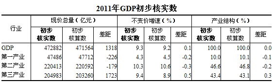 根據(jù)國家統(tǒng)計局《關于印發(fā)<關于我國GDP核算和數(shù)據(jù)發(fā)布制度的改革>的通知》(國統(tǒng)字[2003]70號)的規(guī)定,年度國內(nèi)生產(chǎn)總值核算包括初步核算、初步核實和最終核實三個階段。近日,國家統(tǒng)計局根據(jù)2011年統(tǒng)計年報資料、部分行業(yè)財務資料和抽樣調查資料,對2011年國內(nèi)生產(chǎn)總值進行了初步核實,主要結果如下: