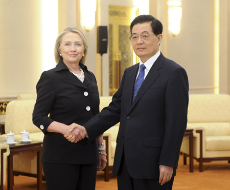 國家主席胡錦濤5日上午在人民大會堂會見了美國國務(wù)卿希拉里·克林頓。