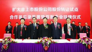 在掛牌儀式上,中國證監(jiān)會副主席姚剛與北京市常務(wù)副市長李士祥、天津市常務(wù)副市長崔津渡、上海市副市長屠光紹和湖北省副省長趙斌分別簽署合作備忘錄,來自北京中關(guān)村、天津濱海、上海張江和武漢東湖四家高新技術(shù)園區(qū)的8家公司負責人為掛牌交易共同敲鐘。